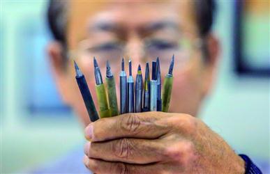 十多平米的工作室里,墙上挂着的尽是钟立维的代表作《富春山居图》、《韩熙载夜宴图》、《兰亭集序》、《虢国夫人游春图》……每件作品都经过数以万计,甚至更多次地敲打凿刻脱胎而出。刻瓷不比在纸上作画,没有更改的余地。雕刻主要有钻刀法、双勾法和刮刀法。钻刀法是指用小锤均匀地敲打刻刀,使之在瓷器表面形成大小、疏密、深浅不同的点,构成画面或字体;双勾法是用锐利的刻刀沿字体或画面的外轮廓刻画;刮刀法则是先用双勾法刻出字画轮廓,然后再将双线间的瓷釉刮去,以便填色。