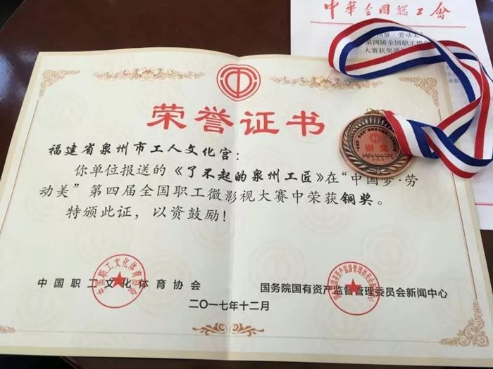 《了不起的泉州工匠》是泉州市总工会、泉州市工人文化宫和福建泉州金马传媒有限责任公司为首批“泉州工匠”量身打造的系列人物微视频。日前,《了不起的泉州工匠——赖礼同》荣获“中国梦·劳动美”第四届全国职工微影视大赛铜奖。