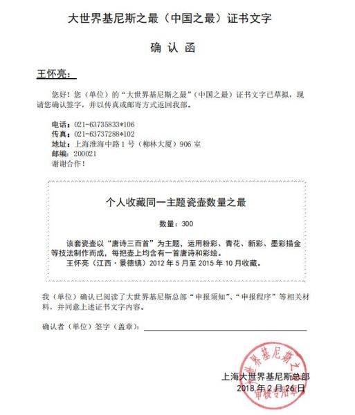 景德镇陶瓷艺术大师王怀亮先生用五年的时间,组织景德镇54位艺术大师,用中国陶瓷最主要的绘画语言,完成了举世瞩目、天下无双的唐诗三百首大师壶。此套壶以大格局思维、三百首唐诗的经典画面的大主题。近日,54位艺术大师共同努力的大手笔、大壮举,得到大世界基尼斯总部的认同,经过几个月的申报、评审并获得通过。