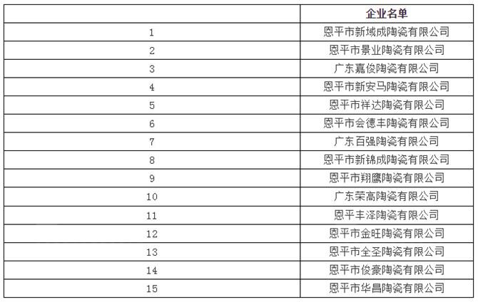 日前,江门市环保局发布了《2018年江门市重点排污单位名录》。据悉,2018年广东江门重点排污单位共294家,其中,水环境重点排污单位(224家),大气环境重点排污单位(42家),土壤环境重点监管单位(28家)。恩平的15家陶瓷厂被列入大气环境重点排污单位名录。