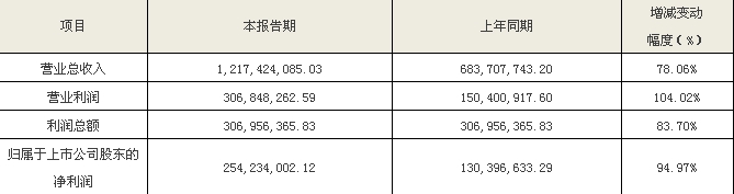 2017 年,山东国瓷功能材料股份有限公司实现营业总收入1,217,424,085.03.元,较上年同期增长78.06%;营业利润306,848,262.59元,较上年同期增长104.02%;利润总额306,956,365.83元,较上年同期增长83.70%;