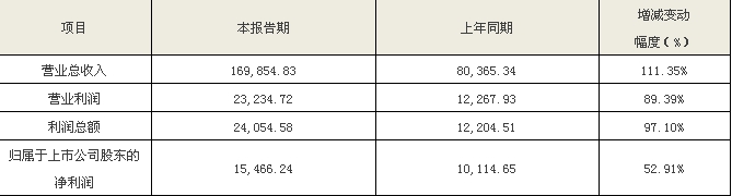 报告期内,广东道氏技术有限公司营业总收入为169,854.83万元,和上年同期相比,增长111.35%;公司营业利润为23,234.72万元,和上年同期相比增长89.39%。报告期内,公司利润总额为24,054.58万元,和上年同期相比增长97.10%。