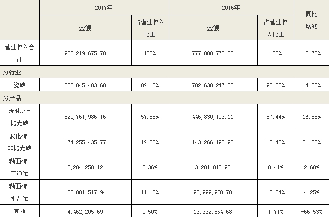 瓷砖业务在2017年营业收入就达到了8.02亿元,同比增长14.26%。因此,瓷砖业务就占到营收比重的89.18%,而从产品结构的贡献占比中,抛光砖所占的营收比重较大,为57.85%。其中医疗收入同比增加1,346万元,健康环境同比增加439万元。