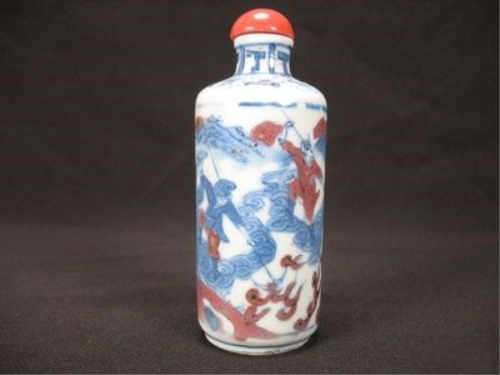 目前所知的瓷胎鼻烟壶中以青花鼻烟壶最为丰富。陶瓷类鼻烟壶在清代产量很大,康熙年间青花鼻烟壶较为多见,单色釉、珐琅彩鼻烟壶则较少见。雍正、乾隆年间青花鼻烟壶画工比康熙时更工整,题材使用广泛,产量大,青花发色纯正。道光年间青花鼻烟壶虽然产量超过前期,但水准却大打折扣。此时除少量官窑器外,大多产品瓷质疏松,画工也欠严谨,款识多是书写堂款或是图记款。光绪至民国年间所制青花及青花釉里红鼻烟壶,釉色偏白,画工多不精,精品如凤毛鳞角。现代新仿品,底足款识多以细笔平描,釉面光亮,画面上人物、山景、房舍等多先以细笔勾勒轮廓,再在所勾勒轮廓内加绘青花。