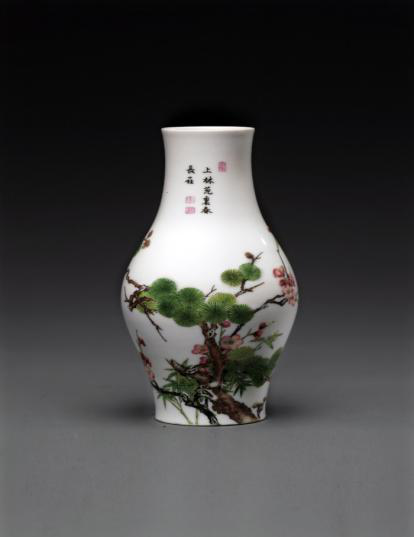 清代还有进一步的创新,出现了粉彩、珐琅彩和釉里三彩。这些创新均产生于清代全盛的康雍乾时代。粉彩始于康熙年间,成型于雍正,粉彩色彩糅合,皴染丰富,直至袁世凯称帝时还有烧造所谓“洪宪”粉彩器。珐琅彩诞生于欧洲,清廷平定台湾开放商贸后引进中国,清代珐琅彩尤其乾隆年间的特色表现为精密繁复,雍荣华贵。釉里三彩又称釉下三彩,是康熙朝集青花、釉里红、豆青三种色彩于同一器上的新品种,由于烧造技术颇为复杂,流传后世的器物较少。清代后期陶瓷业制造业随着国力衰退日益衰落,虽然嘉庆朝粉彩瓷、道光朝青花山水、咸同年间的一些彩器也不乏精品,但总的荒颓趋势已经不可逆转。