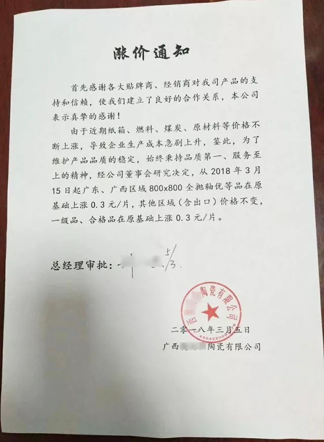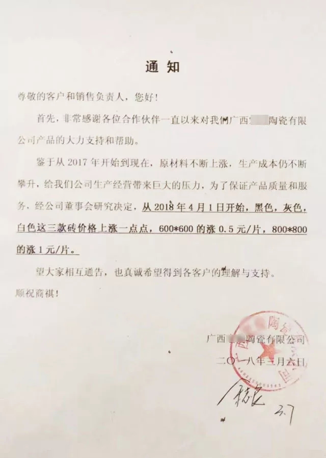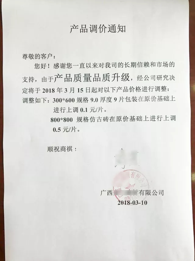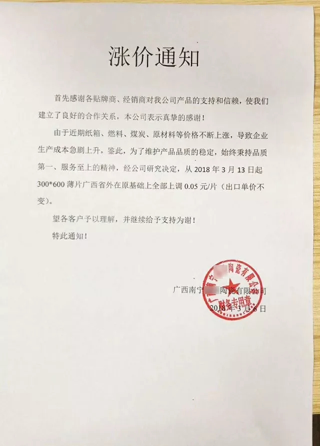 近日,广西产区,包括南宁、贺州、藤县、桂平等地多家陶瓷生产企业均发出涨价通知,将在3月15日左右上调产品价格,涉及产品包括仿古砖、瓷片、外墙砖、抛光砖、全抛釉等。