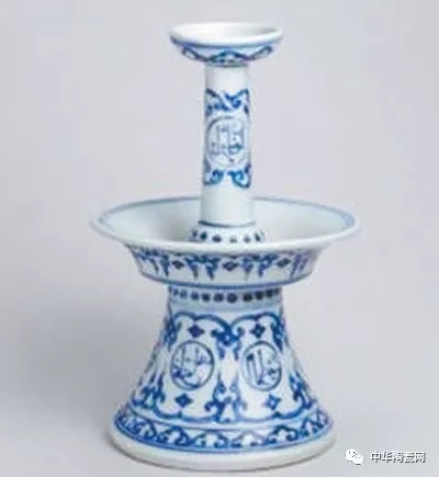 这是一件明正德年间的青花烛台。烛台很复杂,由四部分组成,最上端为蜡烛插口,外壁绘如意云头纹;其下为烛台细长支柱,中部绘圆形开光,开光内书写阿拉伯文,上下分别绘勾莲花枝纹及菱形纹。再下为承托圆盘,也绘如意云头纹;最下端为喇叭形台座,也绘圆形开光,开光内书写阿拉伯文,开光上下分别绘勾莲花枝纹及菱形纹。烛台上的阿拉伯文与传统纹饰,表现出阿拉伯文化与中华传统文化的交融。