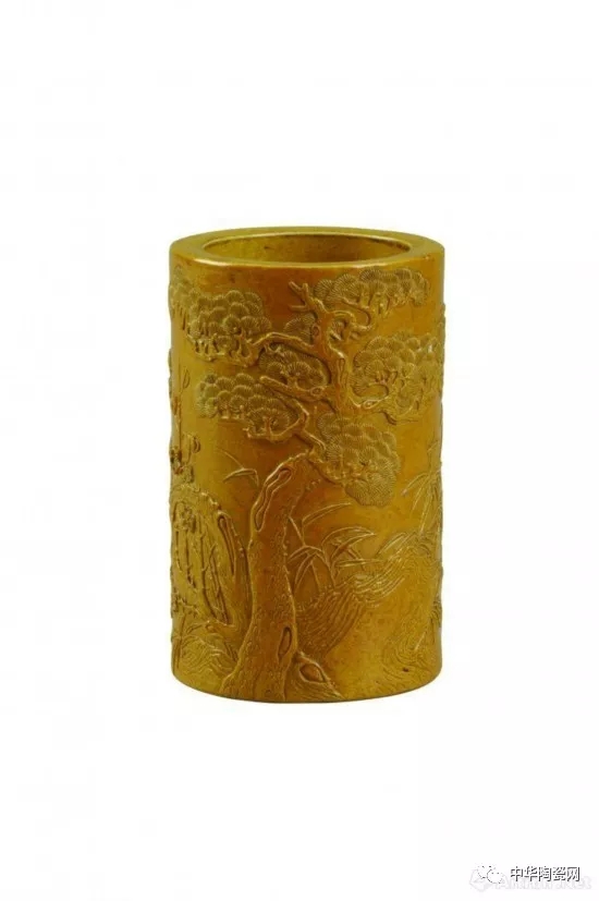 图1:“黄戚福”款黄釉雕瓷松竹梅纹笔筒