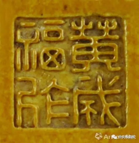 这件“黄戚福”款黄釉雕瓷松竹梅纹笔筒(图1),高12.7、口径7.9、底径7.8厘米,是上世纪50年代安徽省博物馆在合肥市征集入藏的一件雕瓷工艺精品,2002年出版的《安徽省博物馆藏瓷》一书中就收录有这件雕瓷笔筒。此笔筒平唇,直筒形,圈足,通体施黄釉,从造型到颜色都酷似竹雕笔筒。筒身一周刻松、竹、梅“岁寒三友”图案,雕工精细,以刻刀将瓷地剔除,以阳纹的形式突出纹样,表现了苍松之挺拔、修竹之傲骨、腊梅之多姿,整个图案浑然一体,典雅庄重,意境高远。而在笔筒的底部,还刻有“黄戚福作”四字阳文篆书印章款(图2)。从整体风格来看,该笔筒应为清代中后期作品。