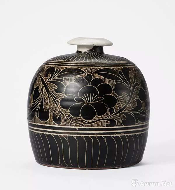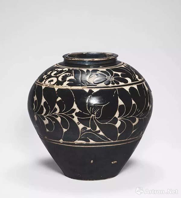 金至元黑釉剔刻花牡丹纹罐,形制周正,气韵挺拔。外壁采用双层化妆土的剔花手法装饰缠枝牡丹、卷叶纹,黑白分明。黑釉发色纯正,釉面厚润具质感,不同于泛褐色的常见品,白色也是纯度极高,比常见的泛黄或直接露底胎者高级很多。经转流传数百年,除釉面的轻微使用痕迹外,品相完整,釉光滋润,可称珍品。