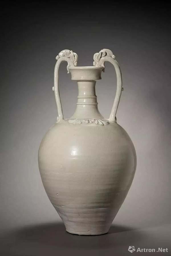 白釉双龙柄瓶,河南巩县窑制品,体型硕大,气势非凡。双龙瓶多见素身器,带有模印贴塑花纹者较为少见,本器肩部对称贴塑两组卷叶纹,十分精致,品级甚高。