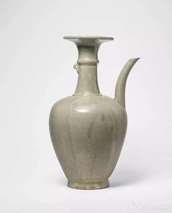 越窑青釉刻划花盘口注壶,式样新颖,气质独特。通体刻划花装饰,以针状利器细刻纹样,腹部主题纹饰为四组S型双交枝牡丹,口沿、颈部、弯流等辅以漩涡状卷草纹,为越窑经典装饰纹样,线条纤细流畅,工艺精湛。此式盘口长颈注壶在越窑产品中见,辽瓷中却常有,尤其盘口、长颈、竹节等特征在同时期的北方器物中比较流行,此物极有可能为吴越国专门制作的贡辽物品。整器挺拔俊秀,制作精美,是为南北方艺术兼容并蓄的代表,也体现著当时吴越国与辽互为往来的交流状况。