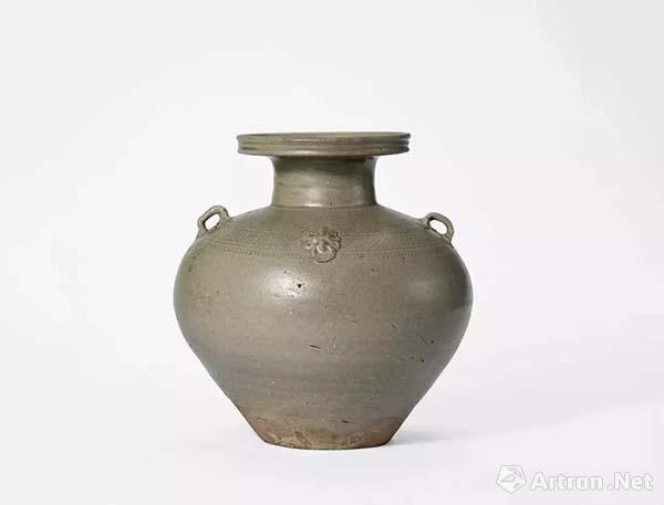 青釉兽面双系盘口壶,乃西晋青瓷标准器,器风古拙自然,具有很高的历史及学术价值。施釉至下腹,控釉技术高,釉色明淨。旧配日本松木盒,并有墨书签条,内容为“重要美术品”、“古越磁兽环双耳壶”,可知早年为日本私人收藏。