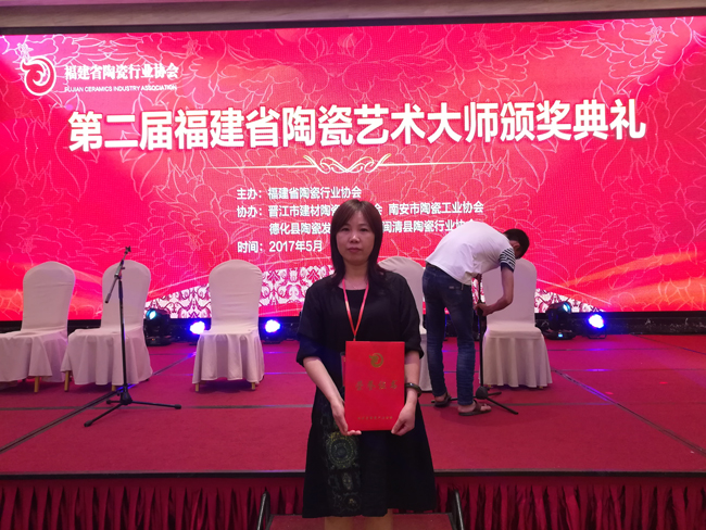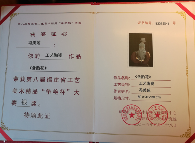 2015年《含胎花》获第七届福建省工艺美术精品“争艳杯”大赛银奖;