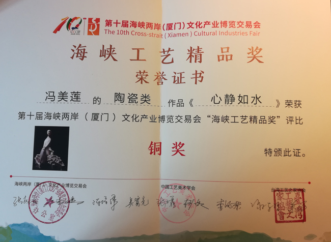 作品《心静如水》在“海峡工艺精品奖”评奖中荣获铜奖