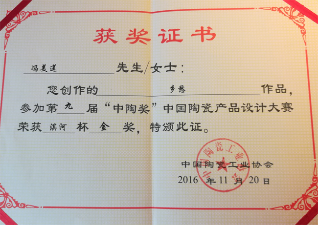 2016年《乡愁》获中国陶瓷工业协会主办的第九届“中陶杯”中国陶瓷产品设计大赛“淇河”杯金奖、第九届海峡两岸(厦门)文化产业博览交易会“中华工艺精品奖”金奖。