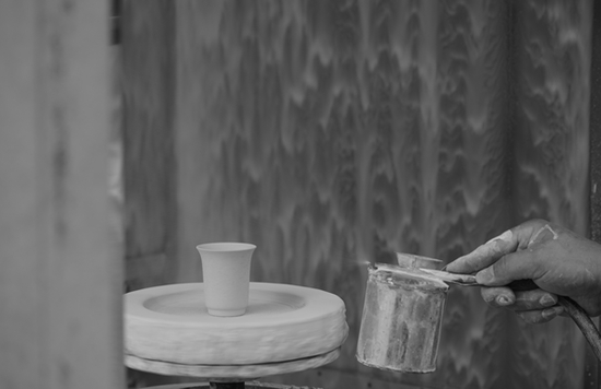 施釉的主要方法有浇釉、吹釉和蘸釉等。在整个陶瓷史上,除了浇釉后来很少使用,其他的方法基本上一直使用,之所以有这么多不同的方法,是因为不同釉的状态不同,瓷器的器形也千变万化,某种釉用在瓶子上可以用蘸釉的方法,但用在小杯子上就可能是吹釉。反之,同一个器形上,不同的釉也需要不同的施釉方法。这一套十二种颜色的盘子,就分别使用了多种施釉的方法。比如洒蓝是吹釉,胭脂红就是拍釉,而黄色可能是涂釉。但不管哪一种方法,要保持釉面的绝对均匀都是不小的挑战。比如涂釉,一笔与一笔之间必然有交搭,而蘸釉,盘子从釉里面取出,釉会流淌,越往下釉自然就越厚。凡此种种。