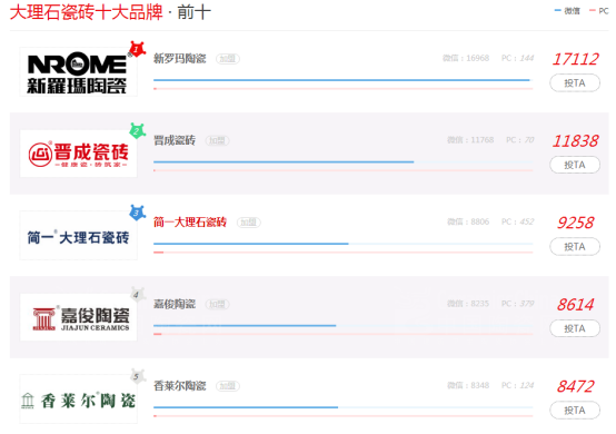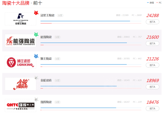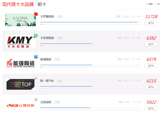 现代砖十大品牌中,卡罗娜颇暂时还是遥遥领先,成为榜单内唯一破万票的品牌,而卡米亚、能强、陶一郎798则同在6000的位置并肩齐进。