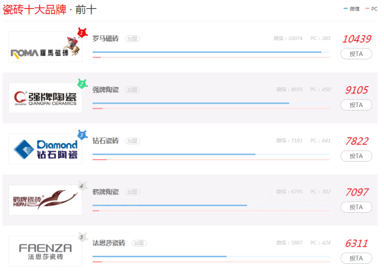 瓷砖十大品牌榜,罗马磁砖继续以11728的高票成功跃居首位,而top5其他四个位置则发生一轮新的洗牌,法恩莎、钻石进步明显,成功挤进前五行列。