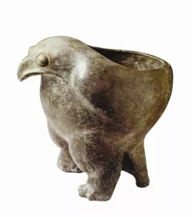 日前去北京参加了一个研讨会,顺便到国家博物馆参观。一件陶尊(图1)给我以震撼,使我驻足长观,久久不愿离去。这件器物高约35.8厘米,整体造型是一只蓄势待发的鹰,双目圆睁,炯炯有神,尖喙成犀利的钩形,体型圆厚,羽毛丰满,神情威猛。鹰体为器身,鹰背为器口,鹰尾和鹰足为器足。鹰的身体与尊形浑然一体,构思精巧,无论从正面还是侧面观看,都给人一种美的感觉。这件陶鹰尊体现了艺术性和实用性的完美结合。为了加大器物内部容量,鹰的两条腿塑成中空;为了增加其稳定性,将鹰的尾巴搭地,自然形成“三足鼎立”形状。将酒器尊设计成鹰形,表现出工匠们的聪明才智,实在是新石器时期的一件陶塑与实用器的杰作。我深深叹服古人高超的制陶技艺和质朴的审美情趣。据工作人员介绍,1993年北京首次申办奥运会时,萨马兰奇主席曾亲自挑选七件能代表中国悠久历史和灿烂文明的文物,送往洛桑奥林匹克博物馆展示,这尊黑陶鹰尊便是7位“文物使者”之一。