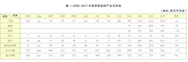 由此不难看出,自2013年起,俄罗斯国内瓷砖消费总量不断下滑,从2013年的2.3亿平方米下降至2017年1.803亿平方米,同时俄罗斯瓷砖进口量也呈下降趋势,从2013年7300万平方米下降至4250万平方米(数据详见表一)。