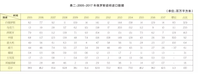 从近十余年,俄罗斯瓷砖进口的详细情况来看,中国瓷砖在俄罗斯市场优势不明显。尤其是2015年至2017年期间,中国瓷砖流向俄罗斯的量大大减少(数据详见表二)。
