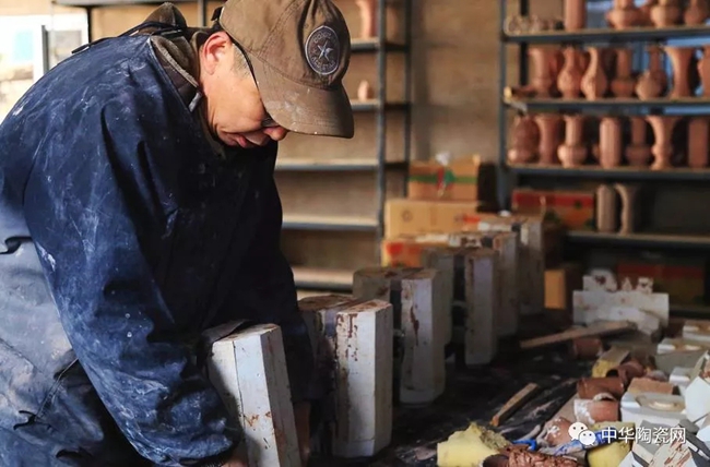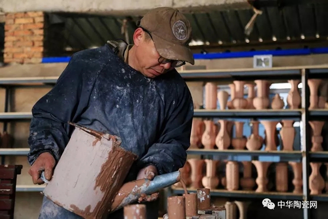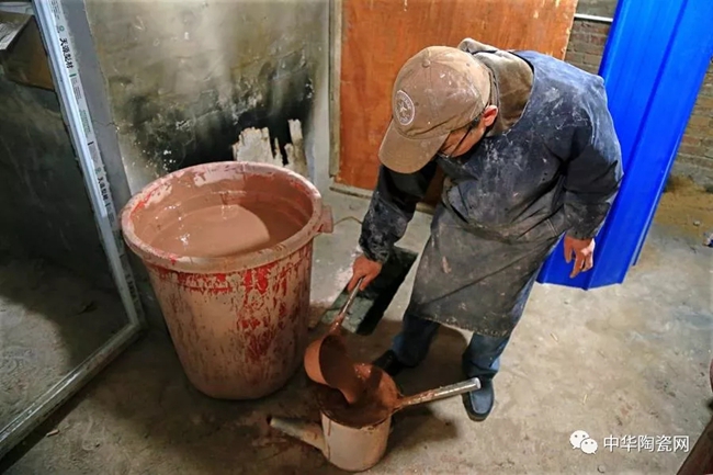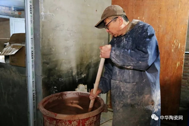 如同平凡的泥土变成珍贵的艺术品前并不能被人一眼看穿其价值。眼前的于乐土实际上曾历任开封北宋官瓷研究所的技术员、研究员、技术副所长等职,从业近30年,作为当代北宋官瓷行业一个深具代表性的人物,他不仅制作出不少官瓷精品,为北宋官瓷赢得了许多荣誉,还首次让当代官瓷作品选入了国家义务教育教科书。图为制作陶浆