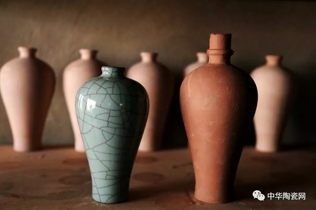 为了更好地推广北宋官瓷,于乐土和他的合作伙伴张卫东成立的“重和宋官窑”公司(重和为宋徽宗的第五个年号),致力于官瓷艺术的复兴,制作了一系列官瓷精品,多次在国内外大展中获奖,让更多人见识了这一瓷界精品的风采。从右至左,就是官瓷从平淡无奇到光彩夺目的幻化,其收缩比大约为17%。