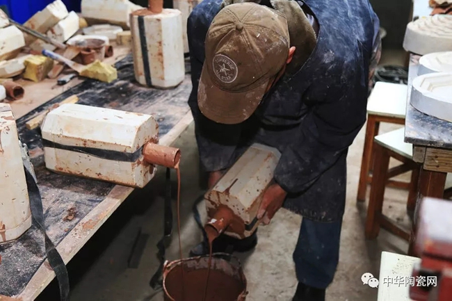 时至今日,在开封城内,有多家官瓷传承机构,于乐土从研发能力到动手制作,技艺全面,正是其中的佼佼者,他为我们演示了官瓷制作的基本过程。图为注浆一定时间后,将模具内未凝结的陶浆倒出,倒出的时机决定着瓷器的厚薄和均匀程度,全凭借匠人积累的经验。
