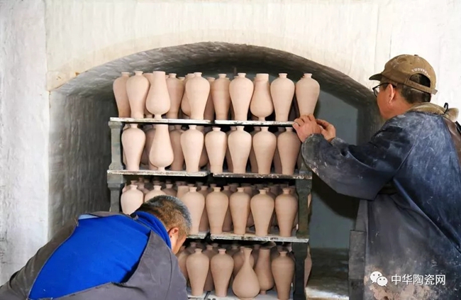 官瓷的釉料,有别于汝瓷等青瓷类的石灰釉,属于石灰碱釉,在高温时具有极高的粘稠度,釉水的流动性极小,因此最忌讳浸釉时吸附不实的微小气泡(孔)存在。一旦入窑烧制,气泡(孔)不会自行修复,而是形成泡状,导致瓷器残损,所以北宋官瓷一直有十窑九不成的说法。因而每次施釉之后,匠人都要认真进行检查,避免每一个上釉时导致前功尽弃的小气泡(孔)。图为入窑素烧