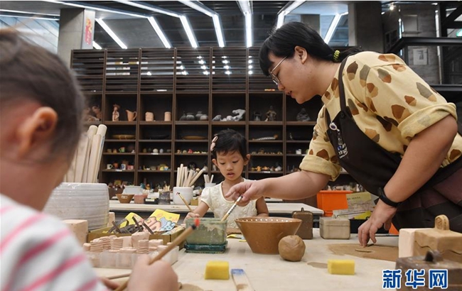 3月31日,工作人员在莺歌陶瓷博物馆陶艺研习室教小朋友捏陶泥。莺歌古镇位于台湾新北市,当地设有陶瓷博物馆、陶瓷主题公园和陶瓷老街等,有“台湾景德镇”之誉,是感受陶瓷文化的好去处。新华社记者林善传摄