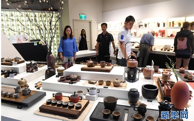 3月31日,游客在一家茶具店参观。莺歌古镇位于台湾新北市,当地设有陶瓷博物馆、陶瓷主题公园和陶瓷老街等,有“台湾景德镇”之誉,是感受陶瓷文化的好去处。新华社记者林善传摄