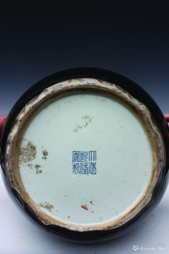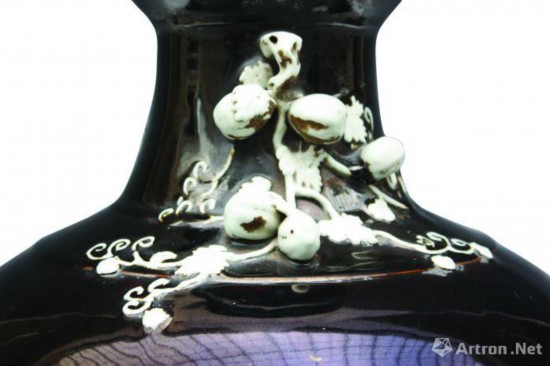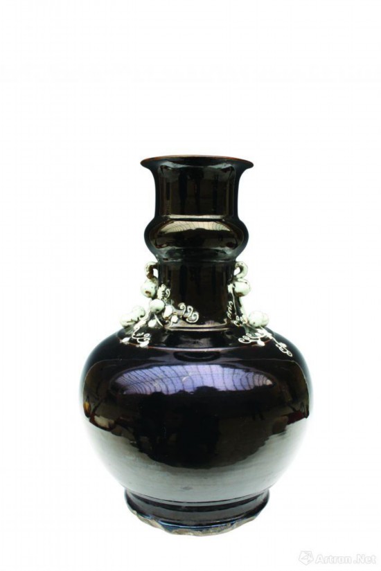 江苏省镇江博物馆藏清乾隆款黑釉白花大瓷瓶(见图),高58.5、口径18.3、足径23.5厘米。口沿外侈,长颈,颈中部凸起,溜望,鼓腹,圈足。足底部“大清乾隆年制”三行六字篆书款。颈部饰二道凸起的弦纹,并饰有白色瓜果,枝叶缠绕。釉面光润透亮,色黑如漆,色白如粉。显得凝重华贵,自有气势。乌金釉不易烧制成功,成品率低。关于乌金釉的配制方法,康熙六十一年法国耶稣会传教士昂特雷克莱在景德镇写给该教会会计奥日神父的信中谈到乌金釉的配制方法:“要赋予瓷器以带光彩的黑色或称之为乌光色,就将瓷坯浸在以青料为主要成分的混合釉中。制作乌金釉一定要使用优质青料,但其浓度要求稍大一些,配制时将青料与白釉、紫金釉混合,并添加少量石灰与凤尾草灰配制的釉灰……”