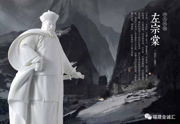 该瓷雕作品充分表现了“左公张正气,千年神武靖边;火炮卷狂飙,一发雄威退敌”的自信与浩然正气。他左手执刀,右手按住狂风吹起的战袍,目视前方,神情淡定自诺、不怒自威,刻画出了其高瞻远瞩、力挽狂澜的人物形象。