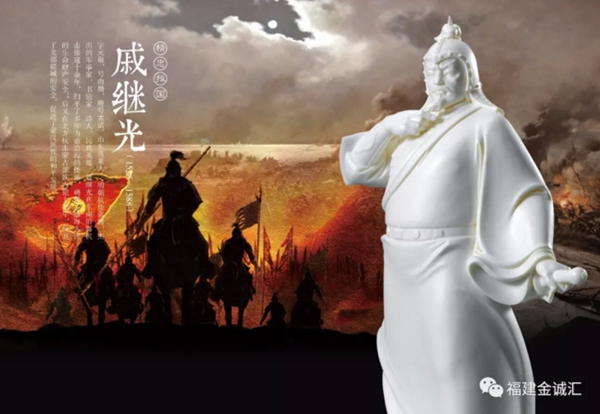 “南北驱驰报国情,江花边月笑平生;一年三百六十日,多是横戈马上行。”出自于戚将军之笔。作品的人物创作力求集武将与文人形象于一身,其丁八步站立,身躯雄伟威严,左手握刀,右手捋须,气盖山河。凝眸远眺大海,朔风吹起,长长战袍犹如海浪般翻滚。作品刚中带柔,不仅体现英雄人物对入侵强敌的誓死反击,还有一份保家卫国、爱民如子的柔美情怀。