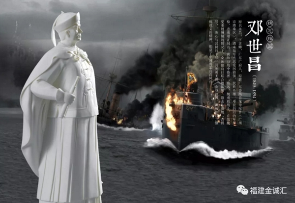 原名永昌,字正卿,广东广府人,原籍广东番禺县龙导尾乡(广州市海珠区),清末海军杰出爱国将领、民族英雄。邓世昌以治军严格、忠勇刚正闻名。黄海海战中,指挥“致远”舰勇敢战斗,在战舰受重创侧倾的情况下,全速撞向日联合舰队第一游击队旗舰“吉野”,决心与其同归于尽。其英勇无畏,舍身救国,视死如归,慷慨就义的精神,彰显了中国海军高尚风骨。