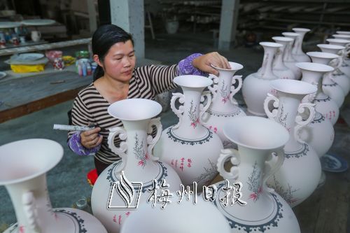 桃源镇昌隆陶瓷厂的工人正在薄坯花瓶上作画。 (吴腾江 摄)