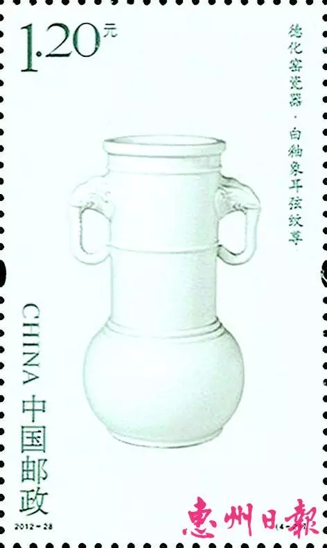 德化县地处福建省中部,与江西景德镇、湖南醴陵并称中国近代三大瓷都,是中国陶瓷文化的发祥地之一。德化窑是我国古代南方著名瓷窑,因窑址位于福建省德化县而得名。中国邮政于2012年10月20日发行《中国陶瓷:德化窑瓷器》特种邮票1套4枚,设计者为谷玉宝,由北京邮票厂印制。邮票主图表现的是代表德化窑特色的四件作品,分别为两件人物和两件器物。在色彩的运用上均采用极为干净的淡色为底,以淡雅娴静衬托主体瓷器的光泽与洁白,让观赏者能更好地体会与揣摩其中的优雅端庄;在背景上加以光影变幻,体现瓷器的立体感,显示其做工精细,栩栩如生。