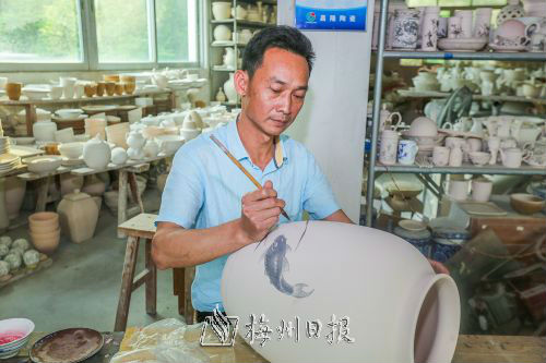 记者日前来到丘汉松的工作室,一打开门,不计其数的陶坯,五彩斑斓的颜料、大大小小的画笔呈现眼前,仿佛置身于一个艺术空间。在记者的请求下,丘汉松“露了一手”,他轻执画笔,身体微倾,半眯双眼在陶罐上一点点勾勒着线条。不一会儿,两条鲜活的鲤鱼便出现在陶罐上尽情“遨游”。