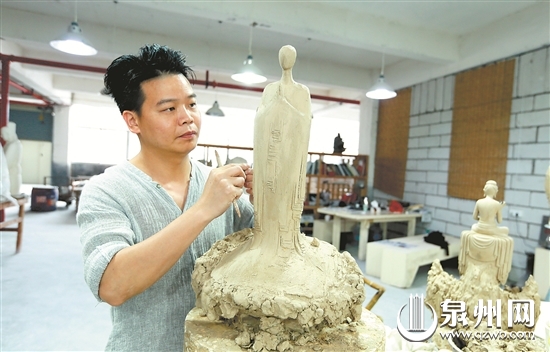 走进李璋高的工作室,只见一座座佛像和仕女像整齐陈列,栩栩如生。有别于传统的人物雕像,李璋高的作品风格鲜明,比如一尊释迦牟尼像,上半身简洁质朴,甚至没有一丝多余的线条来表现服饰,而在佛像下半部,则正好相反,层层叠叠的衣褶与上半身形成鲜明对比,使得作品更显厚重。“我不会按照人们约定俗成的形象去做,更想走‘80后’自己的风格路线。”市场上一些李璋高的作品,一看便知道是出自其手,深深打上了李璋高的艺术符号,备受市场青睐。