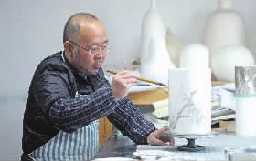 在位于醴陵瓷谷的醴泉窑艺公司里,阳光透过窗户温暖着整个工作室。室内,釉下五彩手工艺人黄彪神情专注在瓷板上。他时而驻足冥思,时而调色运笔,一会儿工夫,鲜艳的画面在瓷板上慢慢地呈现出来。