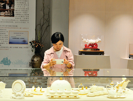 在中国白艺术宫展厅里,各类制作精美的日用家居瓷整齐地摆放着,其中,去年入选金砖国家领导人厦门会晤国宴瓷的《四海同心》系列作品尤为引人注目。这套系列作品主要包括餐具套装、金砖元首杯、茶咖系列套装和洗漱套装等。“不论是餐厅里的餐具、酒具、咖啡具,还是书房里的文房用具,或是洗手间的洗浴用具,应有尽有。”该系列作品创作者陈仁海笑着说。