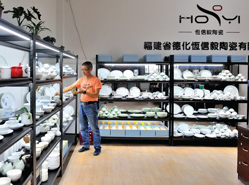 “德化日用家居瓷多以茶具为主,做餐具的很少。有的陶瓷企业生产的餐具还是从广东或山西等地拿半成品来代加工,完全没有德化的品牌特色。其实,德化白瓷瓷质好,做出来的餐具比其他地方更美观耐用。”早年曾在德化协发光洋陶器有限公司等几家德化大型日用家居瓷企业从事陶瓷生产管理的许簪广,一年多前与朋友一起成立德化恒信毅陶瓷公司,主要从事陶瓷餐具的生产和销售。公司成立之初,他通过线上、线下多渠道推广产品,慢慢打开了市场,如今一些外地客商还慕名到德化找他订购餐具产品。