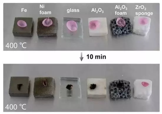 中国的科研团队对海绵陶瓷的耐高温特性进行了实验,实验团队选取了7种不同的陶瓷材料成功制成“海绵”,然后取7毫米厚的各种材料若干,在其表面分别放置7片花瓣,然后用火从底部加热。实验证明,一种叫做氧化锆的陶瓷海绵性能最好,其他材料的上面的花瓣早早就燃烧殆尽,而氧化锆的陶瓷海绵上的花瓣依旧娇艳动人,可见这种材料的优异性能。