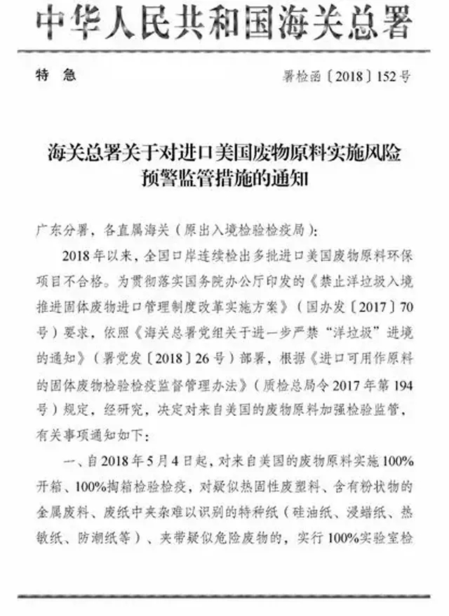 5月2日,国家海关总署发布特急文件《海关总署关于对进口美国废物原料实施风险预警监管措施的通知》,提出5月4日起,对进口美国固废原料实施三方面的监管。包括加强100%开箱,100%掏箱检验检疫,对废纸中夹杂难以识别的特种纸等废物原料实行100%实验室检测分析、对中国检验认证集团北美有限公司实施A类风险预警措施、加强单证审核等三方面监管。
