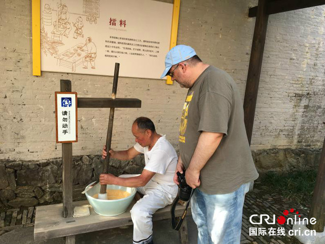 匈牙利记者拉斯洛在景德镇陶瓷民俗博物馆观看陶瓷制作擂料工序。摄影 赵征宇
