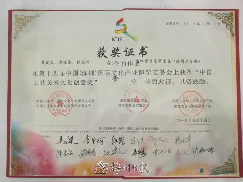 记者昨日从深圳文博会组委会了解到,由广东大埔县怡丰园公司选送的青花骨质瓷“聚宝盆”《清明上河图》,在第十四届深圳文博会上获得“中国工艺美术文化创意奖”金奖。