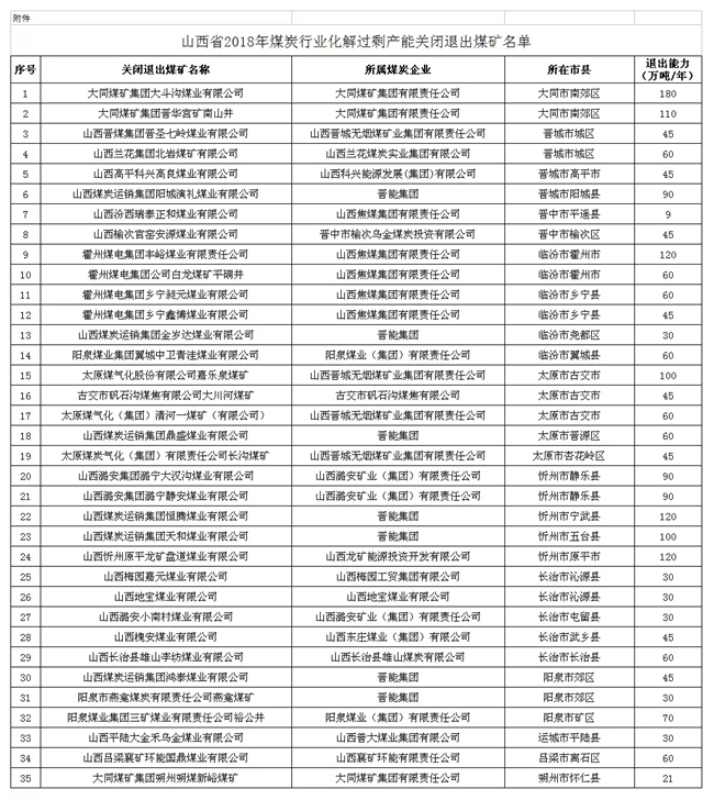 作为我国原煤产量前三甲之一,5月11日,山西省政府下发《关于分解下达2018年煤炭行业化解过剩产能目标任务的通知》,对山西省2018年煤炭行业化解过剩产能关闭退出煤矿名单进行公示。