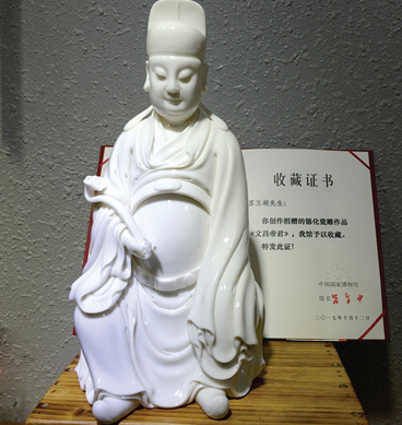 近期,苏玉湖创作更是一发不可收拾,“竹风禅韵”“太公钓鱼”“一叶菩提”“一滴清纯”等系列禅意作品问世。其中,“一叶菩提”在第二届泉州市工艺美术创新设计“天工奖”大赛中荣获三等奖,“佛礼”在2014年上海国际礼品工艺创意设计展览会中获“工艺美术金奖”。“文昌帝君”更被国家最高艺术殿堂——国家博物馆永久收藏。