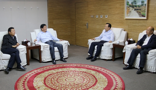 铜川市委书记杨长亚(左二)专程接待了西安翻译学院董事长张水平(左三)一行并亲切座谈